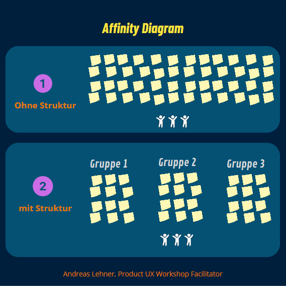 Affinitätsdiagramme helfe dir und deinem Team, unstrukturierte Datenpunkte wie Ideen, Gedanken oder Informationen zu strukturieren. Das Team erhält mehr Übersicht und Ordnung. Das Team kann auf diese Weise die wichtigsten Erkenntnisse und Einsichten (Insights) aus der Vielzahl an Daten besser erkennen.