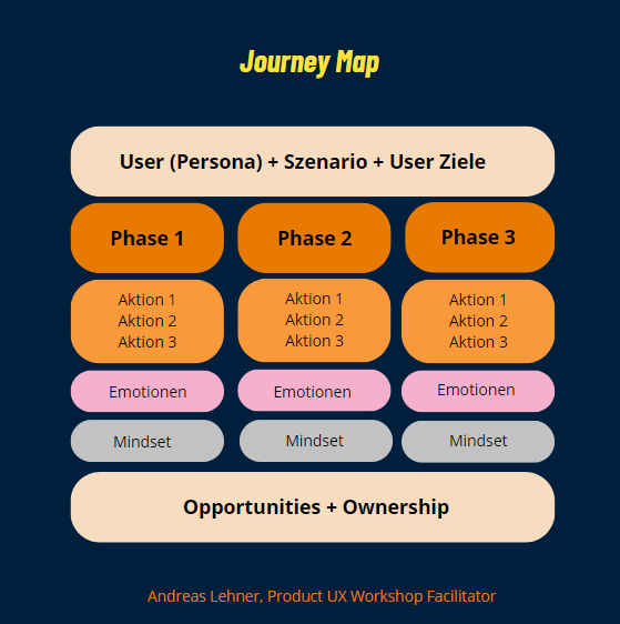 Journey Mapping ist ein universal einsetzbares Werkzeug, um Datenpunkte wie Ideen, Gedanken, Researchdaten, Fakten oder Annahmen in eine vorgegebene Struktur zu bringen.
