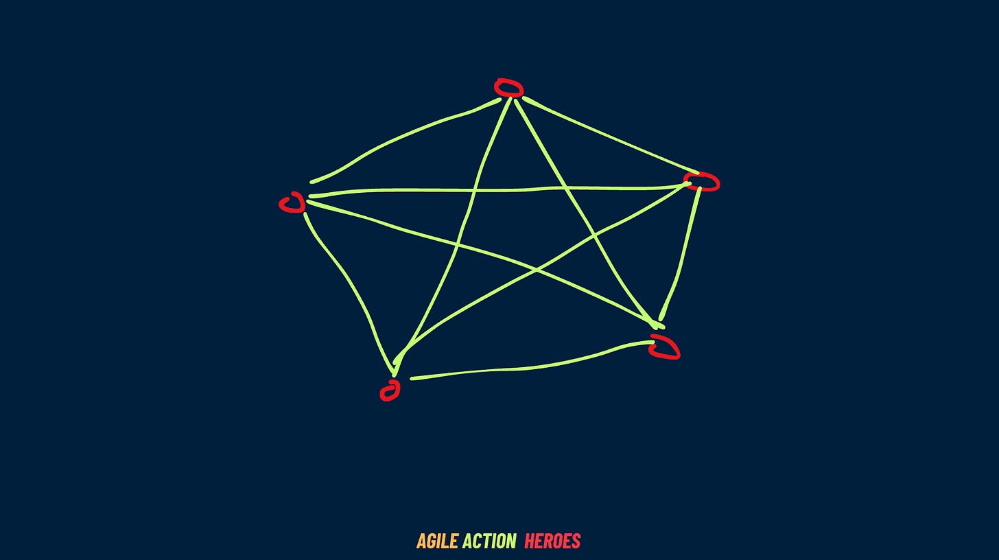 In a Comcon network, every person is equally connected to everyone else, much like a cross-functional agile team where all voices are valued equally.